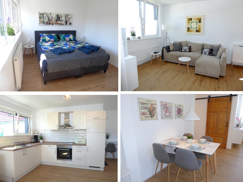Im damaligen Bauernhaus liegt diese urgemütliche Wohnung (ca. 49 qm). Sie ist voll ausgestattet und verfügt über eine kompakte Küchenzeile mit Herd, Kühlschrank, Spülbecken, Wasser- und Kaffeekocher und Mikrowelle. Das große Schlafzimmer für zwei Personen bietet Komfortmatratzen, einen Schreibtisch und ein Bad mit Walk-in-Dusche. Im Wohnzimmer besteht die Möglichkeit für 2 weitere Schlafplätze auf dem Ausziehsofa.