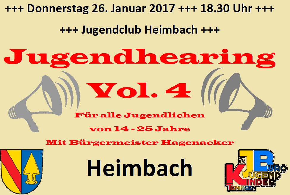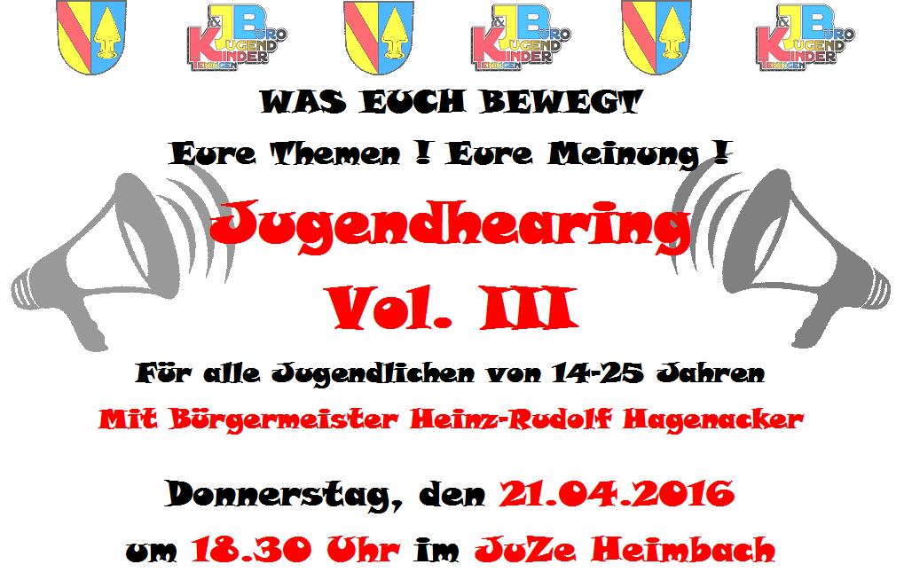 Das Teninger Jugendhearing geht in die nächste Runde. Nachdem Bürgermeister Heinz-Rudolf Hagenacker im März bereits die Jugendtreffs in Heimbach, Köndringen, Nimburg und Teningen besucht hat, lädt er nun die Mitglieder aller Jugendhäuser in den Bürgersaal des Rathauses Teningen ein. Dem Bürgermeister ist es sehr wichtig, in stetigem Kontakt mit Euch zu sein um zu erfahren was Euch bewegt. Am Freitag, den 09.10.2015 ab 18.00 Uhr steht Euch Herr Hagenacker gerne Rede und Antwort. Nutzt die Chance zum Austausch über Aktuelles oder was ihr eventuell in Zukunft vorhabt. Was läuft gut, was nicht? Was kann verbessert werden?