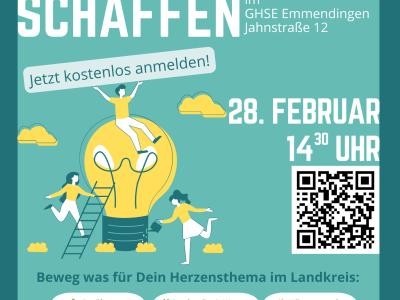 Am 28.Februar lädt das zivilgesellschaftliche Klimaschutznetzwerk “ClimateHub Kreis Emmendingen” um 14:30 ins GHSE Emmendingen (Jahnstraße 12) zum Klima-Mitmach-Tag ein. In sechs off enen Themenräumen von Ernährung bis Energiewende sind Teilnehmende dazu eingeladen, gemeinsam Ideen für bürgerschaftliche Klimaschutzprojekte zu entwickeln, deren Umsetzung dann vom ClimateHub unterstützt wird.