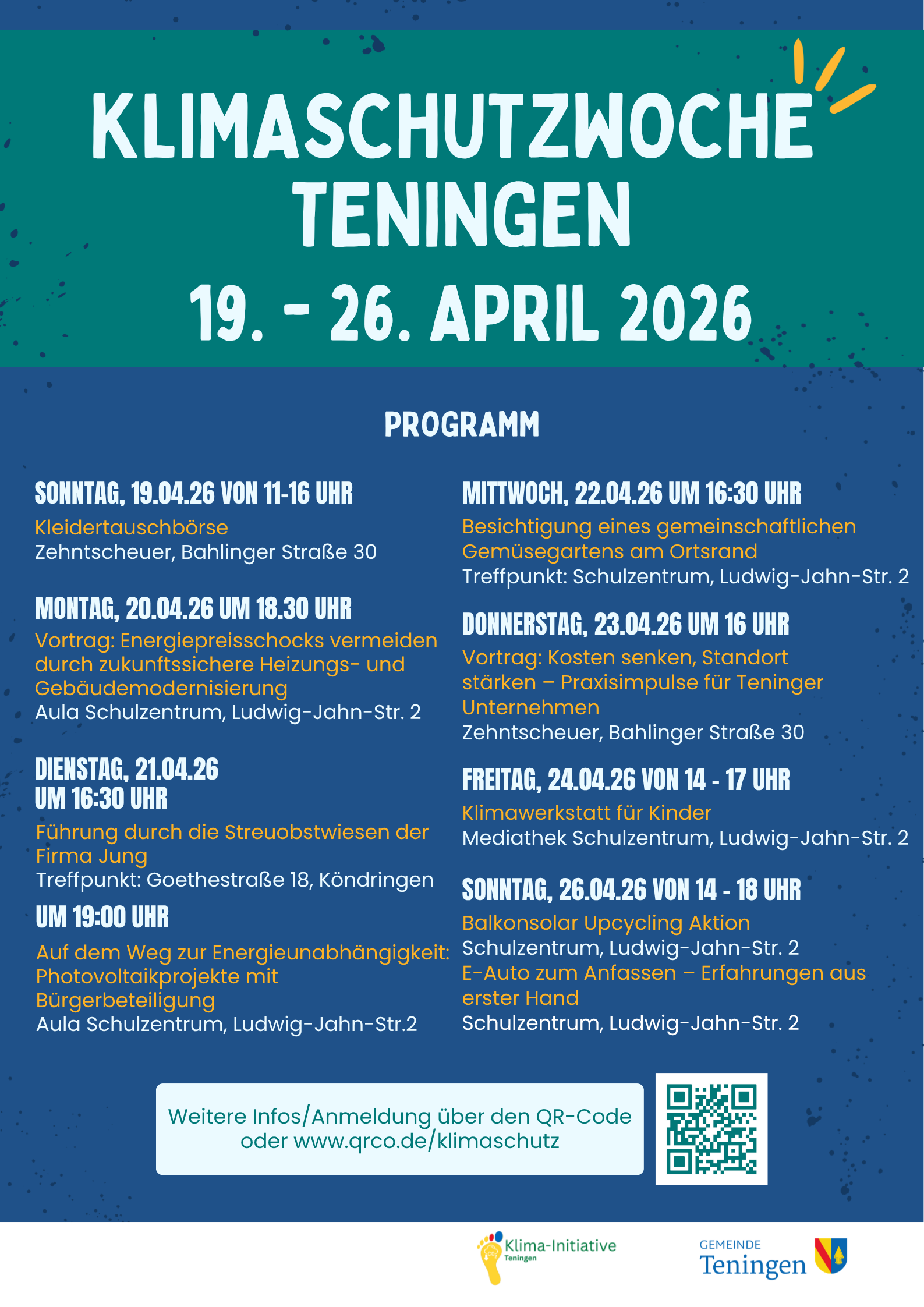 Erleben, entdecken, mitmachen: Die Klimaschutzwoche in Teningen lädt Sie ein, Klimaschutz ganz praktisch kennenzulernen! Freuen Sie sich auf ein abwechslungsreiches Programm mit spannenden Vorträgen, Mitmach-Aktionen und vielen Ideen für einen nachhaltigeren Alltag. Ob bei der Kleidertauschbörse, spannenden Vorträgen zur energetischen Sanierung bzw. Photovoltaikprojekten, bei der Besichtigung eines gemeinschaftlichen Gemüsegartens oder beim gemeinsamen Austausch mit anderen Unternehmen – hier wird Klimaschutz greifbar und gemeinschaftlich erlebbar.